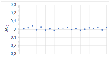 각 측정마다 바이알이 제거되고 바이알 홀더에 다시 삽입되었습니다. 이로써 바이알 자체의 영향을 포함한 기기 성능이 표시되었습니다. 모든 값은 +/- 0.03% O2 범위 내에 있습니다.